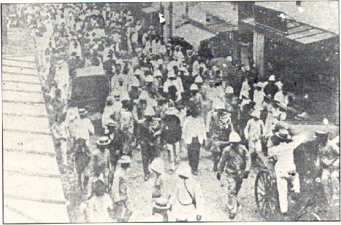 Une foule compacte envahit la rue du Conseil depuis la prison centrale jusqu'au palais de justice. Toutes les classes de la société. Les barreaux sont occupés. Bien plus qu'un jour d'élections ou de procession. La foule emboîte le pas, dense, compacte, très animée. De nombreux cris, des huées sont lancées à l'adresse des accusés, enchaînés deux par deux, séparés par des gendarmes et des agents.»