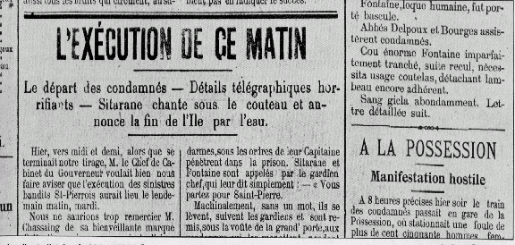 Sitarane et Fontaine passent à l'échafaud le mardi 20 juin 1911 à Saint-Pierre. Afin d'éviter l'afflux de spectateurs, la police et la gendarmerie n'ont donné que peu de publicité quant aux dates. Mais des bruits courent, et une certaine foule sera là quand même, ainsi que le reporter de «la Patrie Créole» qui écrit, le 22 juin 1911 :